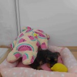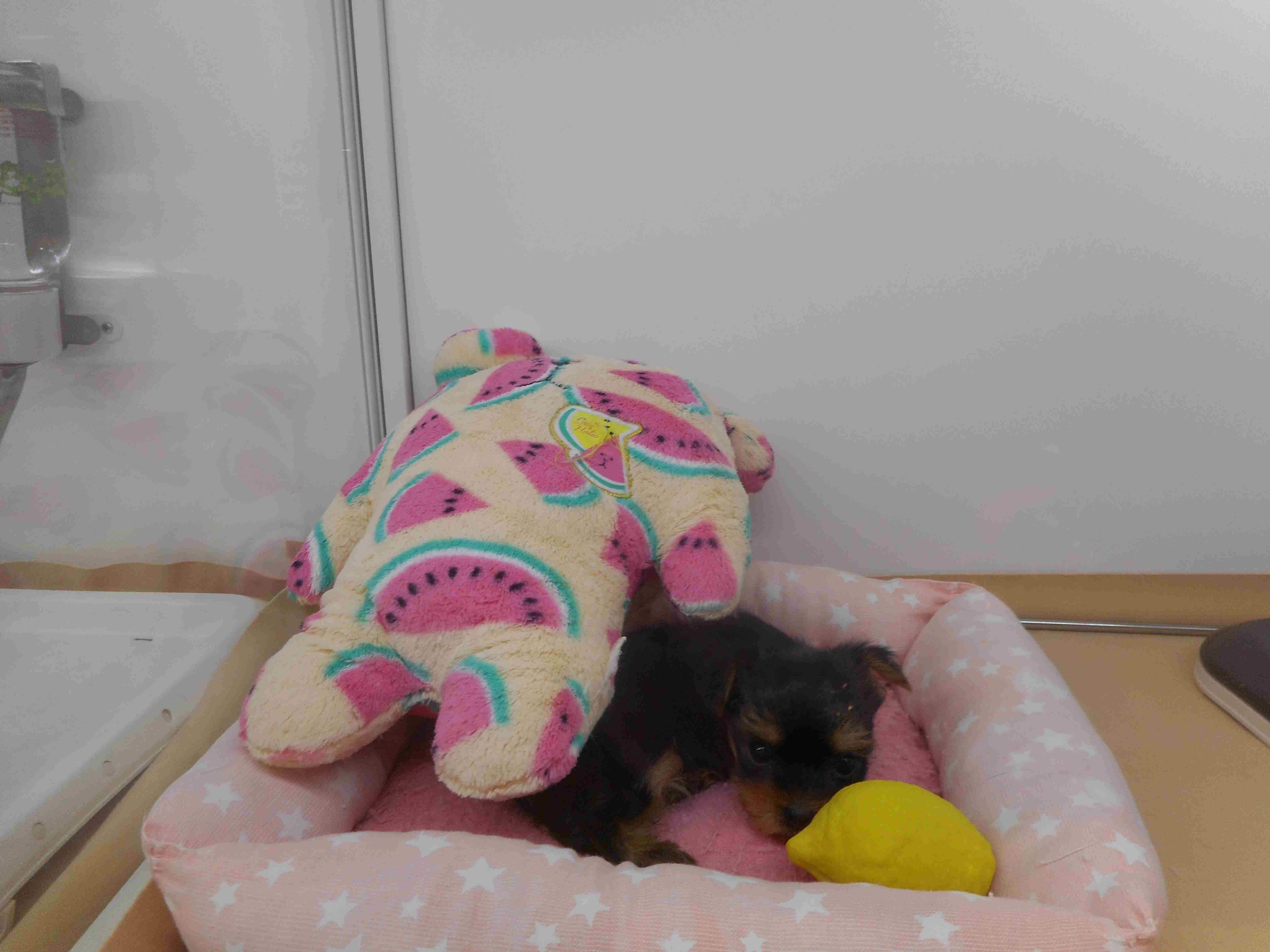 ぬいぐるみさんの下に半分はいって寝るのが好きなようです