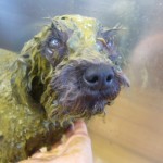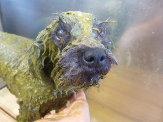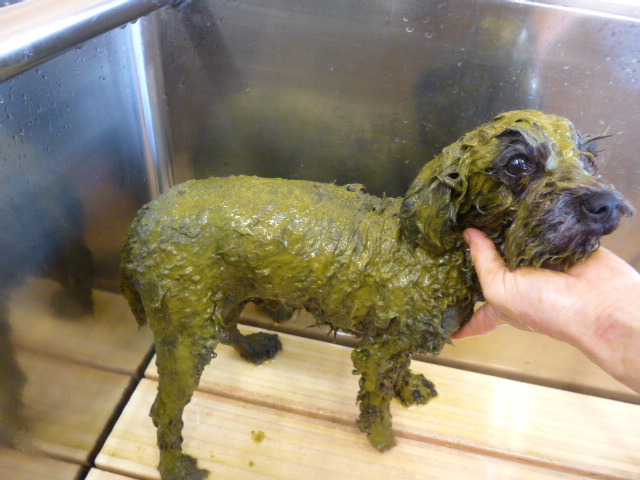 ワンちゃんの体にまんべんなく塗っていきます