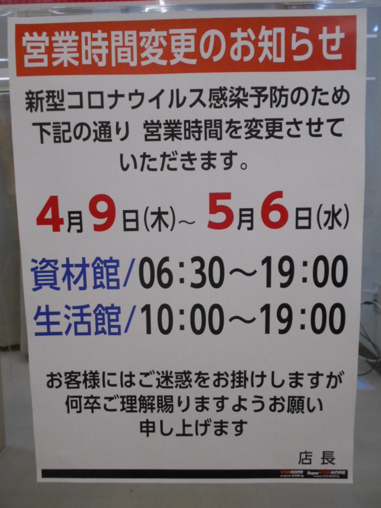 4月9日~5月6日まで営業時間を変更させていただきます。